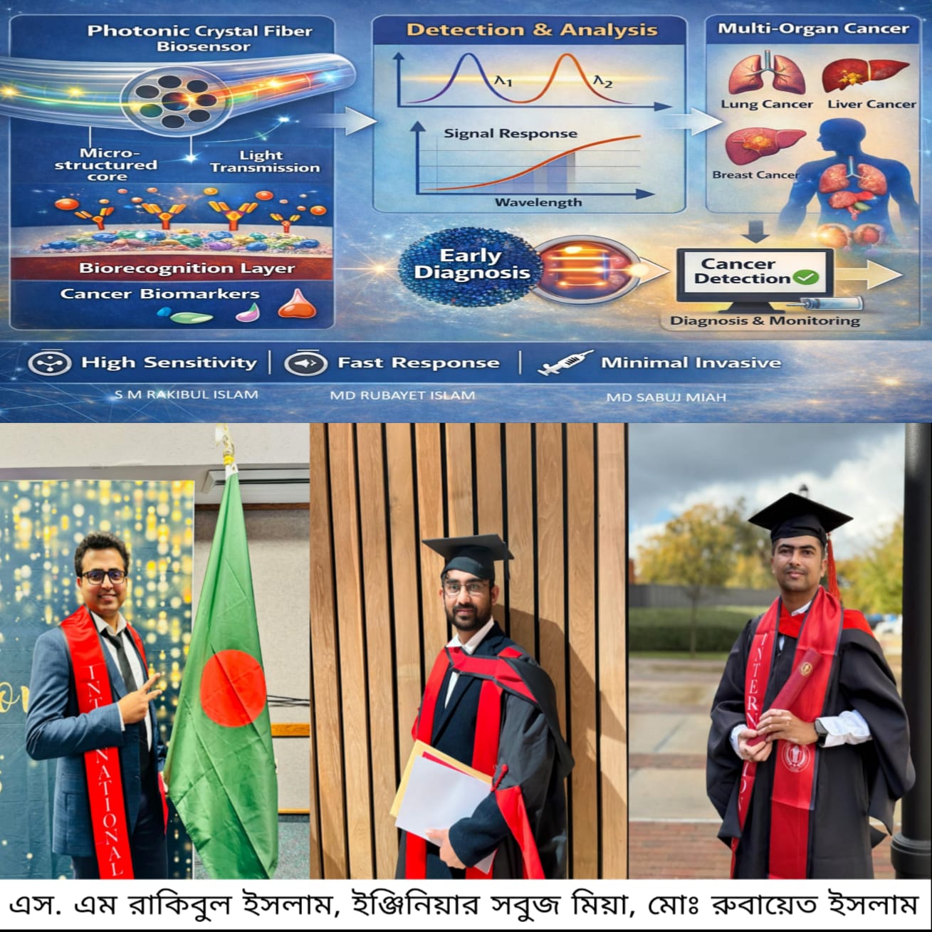 আলোর আধুনিক প্রযুক্তি ব্যবহার করে ক্যান্সার, ডায়াবেটিসসহ বিভিন্ন দীর্ঘস্থায়ী রোগ খুব প্রাথমিক পর্যায়ে শনাক্ত করার সম্ভাবনা তৈরি করেছেন একদল গবেষক। যুক্তরাষ্ট্রের টেক্সাস অঙ্গরাজ্যের Lamar University–এর সঙ্গে আন্তর্জাতিক গবেষণা সহযোগিতার আওতায় এই গবেষণায় কাজ করছেন এস. এম. রাকিবুল ইসলাম, মোহাম্মদ রুবায়েত ইসলাম ও মোহাম্মদ সবুজ মিয়া।